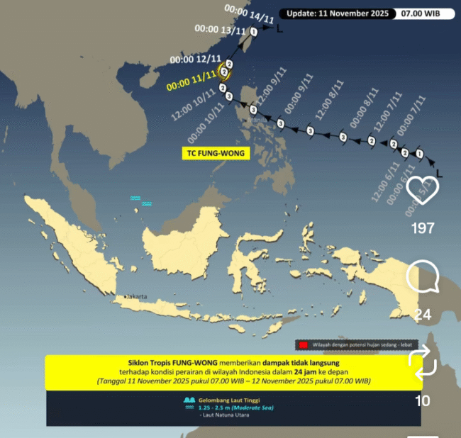 Meskipun posisinya jauh di Laut Filipina, sistem tekanan rendah ini signifikan memengaruhi dinamika cuaca di Indonesia, terutama memicu peningkatan intensitas hujan dan gelombang tinggi.